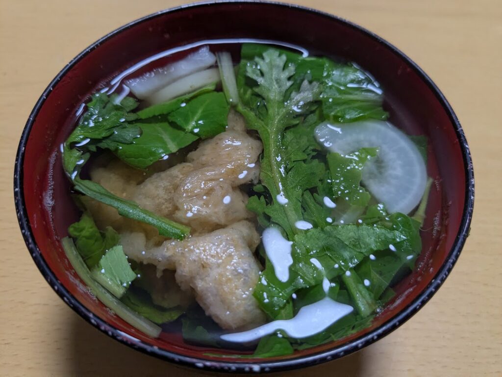 大根、春菊、小松菜に玄米餅で雑煮。