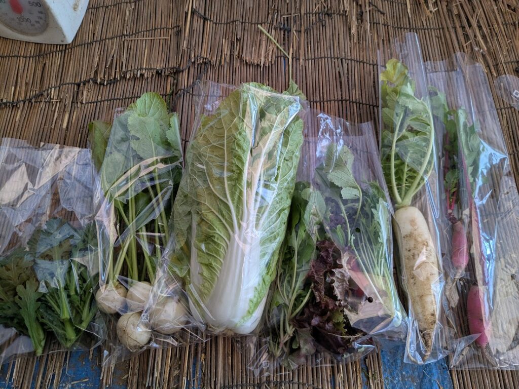 白菜、大根、こかぶ、春菊、菊芋、マイラブサラダセットの6品+おまけ1品